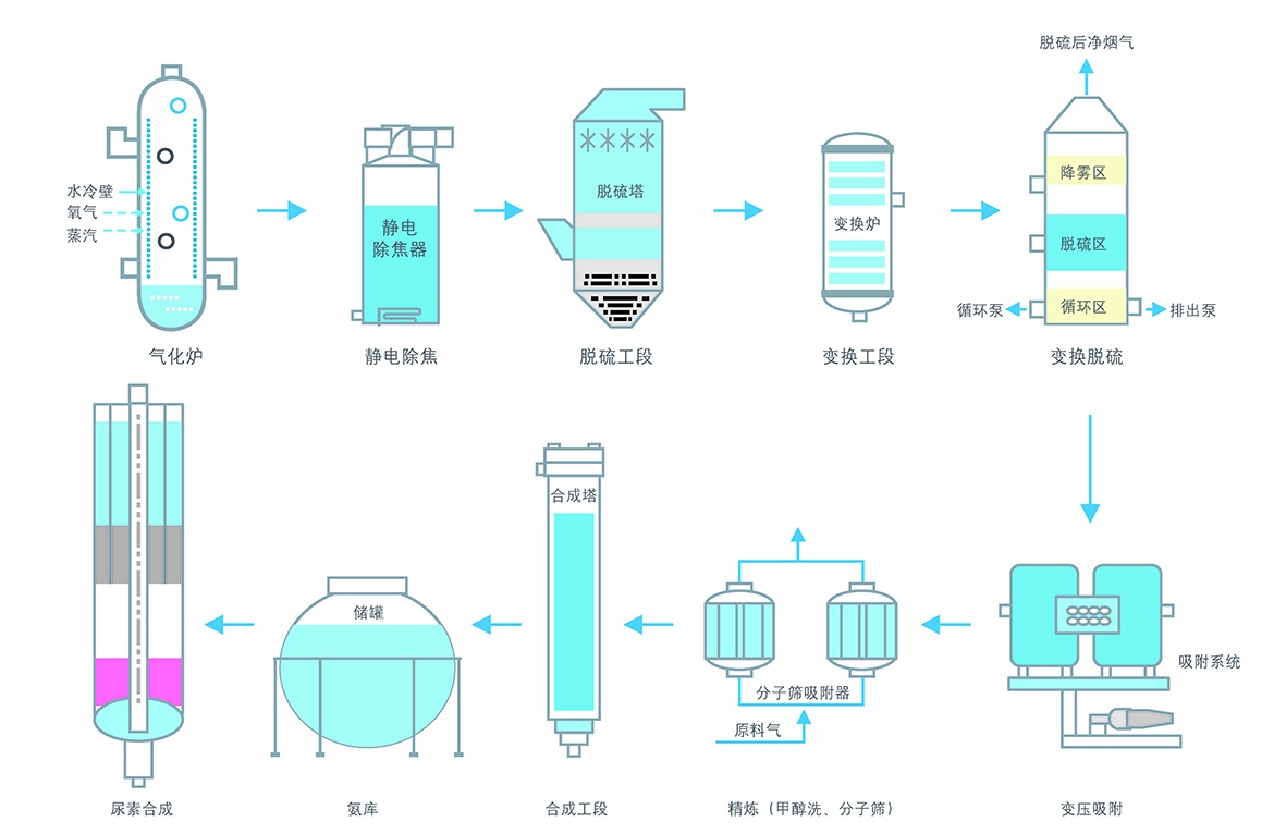 合成氨和尿素都是重要的化工產品,在國民經(jīng)濟中占有重要地位。其主要原料可分為固體原料、液體原料和氣體原料。經(jīng)過近百年的發(fā)展,煤制合成氨制尿素技術趨于成熟,形成了一大批各有特色的工藝流程,但都是由三個基本部分組成,即原料氣制備過程、凈化過程以及氨合成和尿素合成過程。