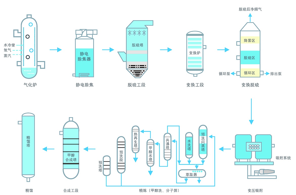 煤制取甲醇是世界公認的石油替代能源,其可作為汽車燃料,也可直接生產乙烯、丙烯、再生產聚乙烯、聚丙烯等石化產品。目前主流的煤制甲醇工藝主要為中壓合成法和低壓合成法。
